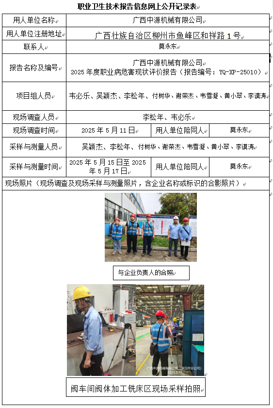 廣西中源機械有限公司2025年度職業病危害現狀評價報告
