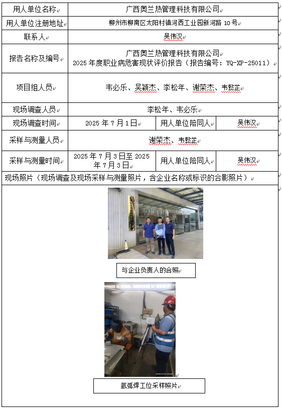 廣西奧蘭熱管理科技有限公司 2025年度職業病危害現狀評價報告