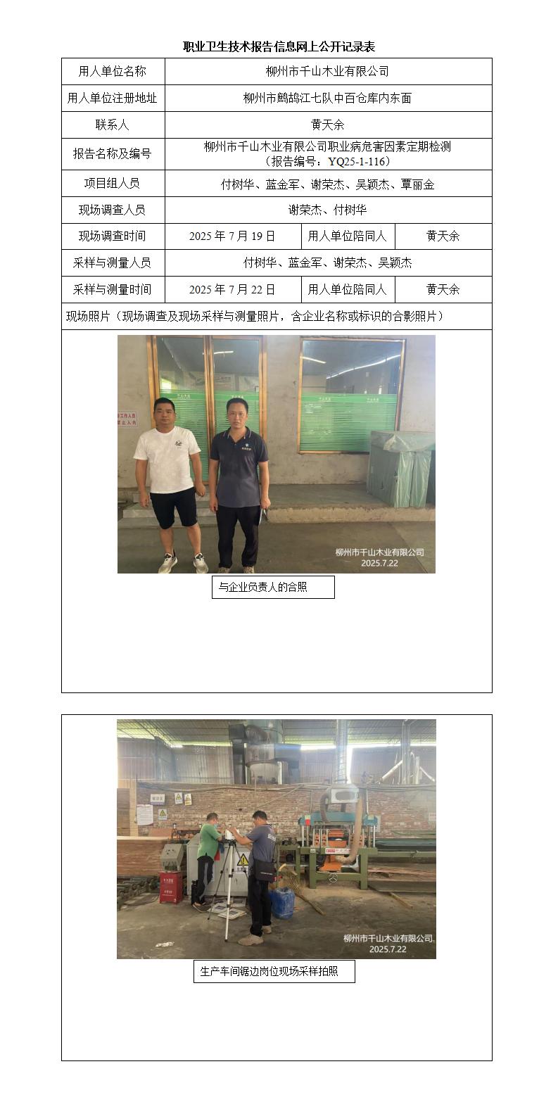 柳州市千山木業有限公司職業病危害因素定期檢測